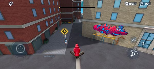1、打开漫威蜘蛛侠2手机版,点击屏幕开始,我们会出生在一个柱子上;
