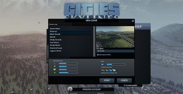游戏进入后,在地图选择界面里可以看到初始有9张幅地图可以选择!地图选择上能看到地图交通、初始资源:石油、矿石、森林、水资源等等的多少,大致的可放置建筑的区域面积占地图的比例!!
