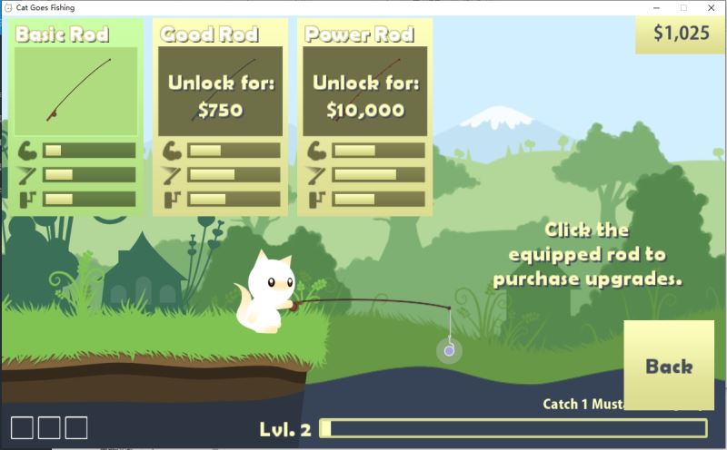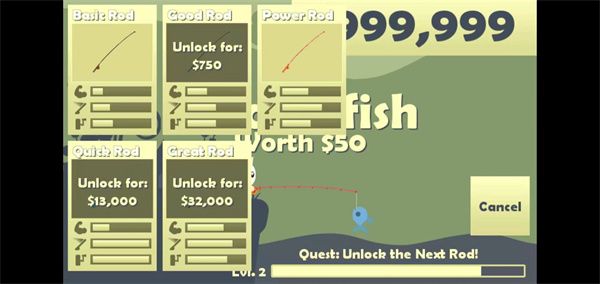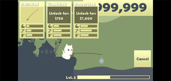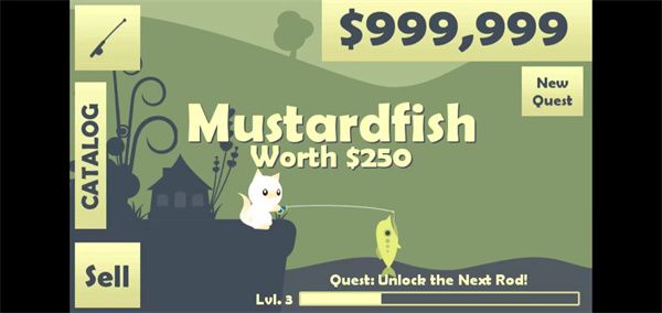4、获得一定的金币后,你可以购买渔具,点击左上角的渔具按钮即可,这样你的鱼钩能抛到更远的地方,钓到更多的鱼。
