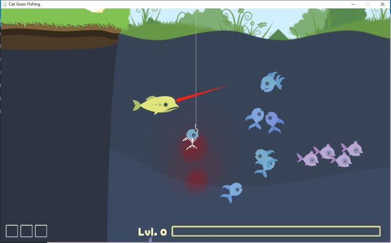 2、进入游戏后,就可以开始钓鱼了,玩家需要按住鼠标先往左边滑动,然后再往右边滑动,注意:中途不要松开鼠标;钓鱼的时候还要小心下图这条黄色的鱼,不要离它太近,不然它会吃掉你的鱼以及鱼饵;要是钓上来的鱼被黄色的鱼咬中,鱼的价格也会被打折出售哦~