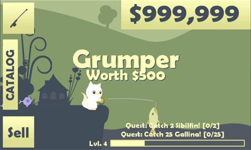 2、钓到鱼后,长按手机屏幕,就可以把鱼钓上来,点击左下角的sell出售可获得金币;