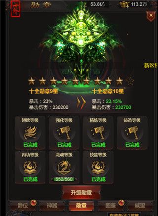 拥有勋章后可对其进行升级,但是勋章升级没有那么简单,需要满足特定条件:要求玩家的翅膀等级,强化等级,精炼等级,铸造等级,内功等级,龙魂等级和技能等级都达到指定级别,这些都缺一不可。满足所有条件后,才能对勋章点击升级。