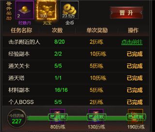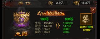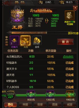 爵位可通过晋升以及提升官位来拥有奖励和增益。爵位晋升需要获取"历练值",可通过完成每日任务获得,请积极完成日常吧,当历练点积攒到一定程度就可获得晋升机会,晋升可提升多种属性的同时,还可以获得元宝,金币和经脉丹等材料奖励。