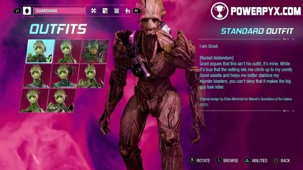 又名树人格鲁特,他可以控制树木,并融合树木治愈自己的伤口、获取营养和增强力量,也不怕火。与火箭浣熊同为银河系的赏金猎人,也是火箭浣熊的雇佣兵以及保镖。