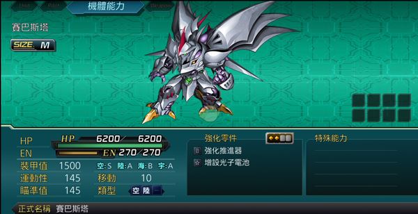 4、CB:我只想说机体很帅,男主有基友,有穿越的女友,槽点配备很完美。主舰也挺实用的,有罩子,有地图炮,精神有突击,标配。合体攻击前期开荒不错,机体武器实在太少了,而且一上场起码两台机子,腿也短,好在ACE是全加移动力的。客观的说,这次新参最弱的机体。