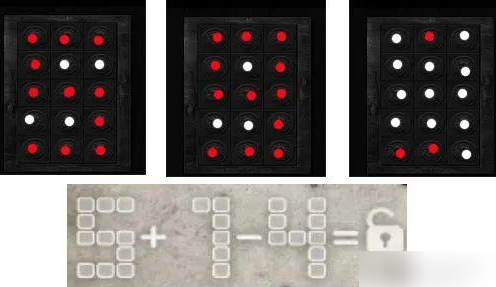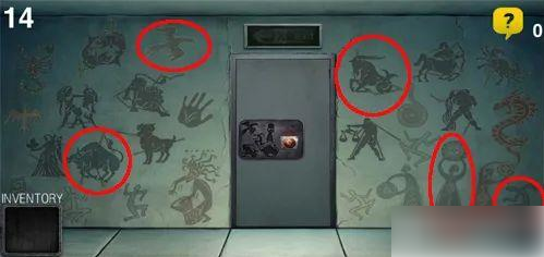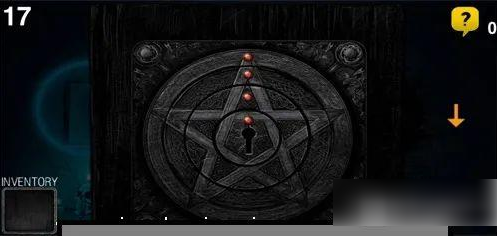 点击刚才记住的四个图形,图形消失,出现一个红色圆圈,点红色圆圈,墙上出现一个洞,里面获得钥匙,点门锁处,把各圈的红点都调到正上方成一条直线,如下图: