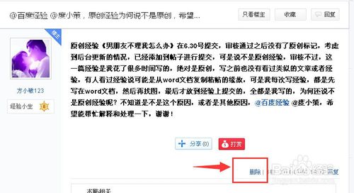来到自己所发的帖子页面,点击帖子下面的“删除”功能。(如下图)
