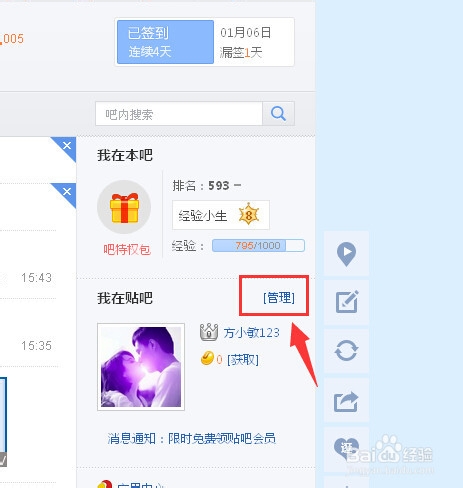在完成登陆之后,把鼠标移到右上角我在贴吧菜单,会弹出来一个“管理”选项,然后点击这个管理功能。(如下图)