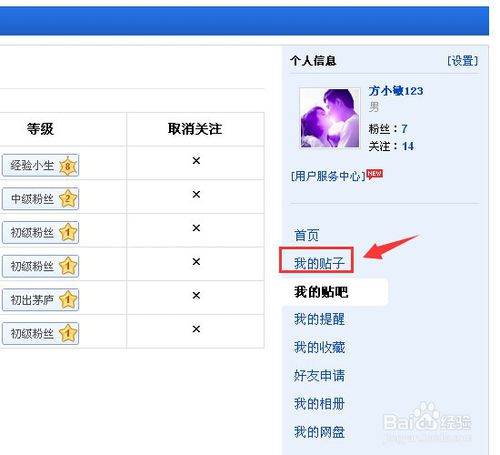 然后来到百度贴吧的个人信息页面,在下面的菜单列表中点击“我的帖子”。(如下图)