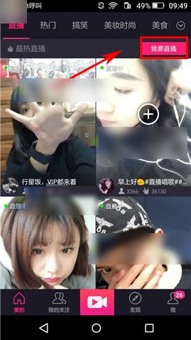 1、点击打开【美拍】,点击右上方的【我要直播】