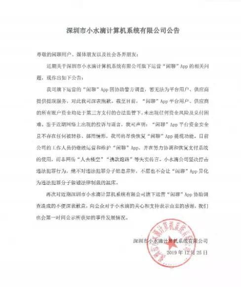 而在昨日有媒体报道,深圳市小水滴计算机系统有限公司,曾于12月25针对近期旗下运营 " 闲聊 "App 的相关问题发布公告:称 " 闲聊 "App 平台坚决打击违法犯罪行为,资金安全且不存在任何被转移、挪用情形,该公司将尽快恢复 " 闲聊 "App 的提现功能。