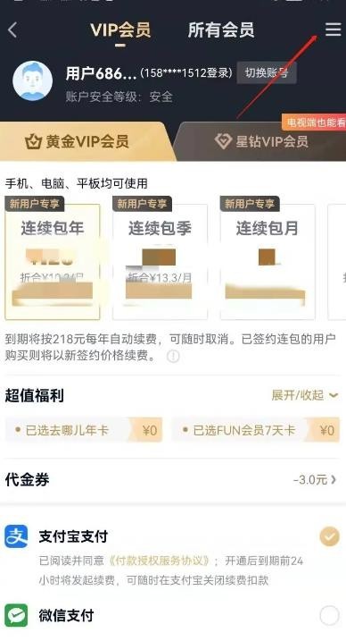 3、点击进入VIP会员的界面,找到右上角的三横线按钮