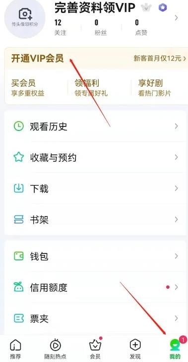 2、打开爱奇艺app,来到“我的”页面,找到上方的“开通VIP会员”提示