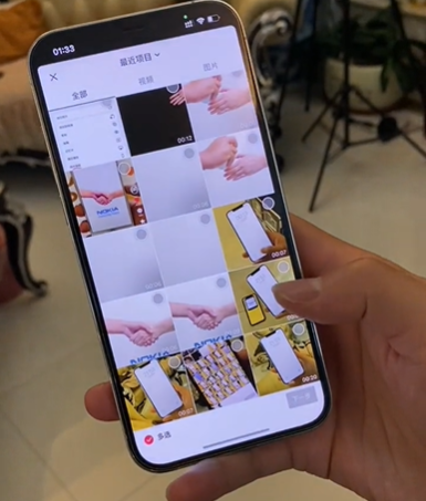 3、然后进入到抖音的主页面点击加号上传作品,在相册当中找到刚刚保存的诺基亚视频壁纸,点击下一步;