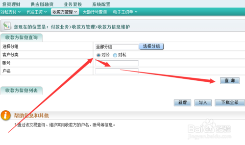 然后勾选收款方客户的分类【对公】or【对私】,之后录入账号或是户名的其中一项,之后点击【查询】按钮。