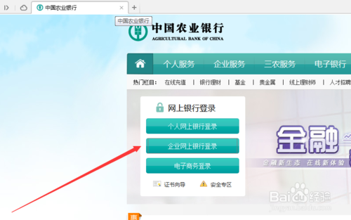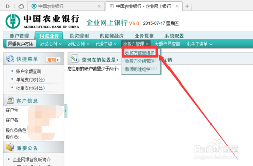 完成了登录操作后,用户进入到农行网银的欢迎界面,在界面的上方箭头所指处的【收款方管理】——【收款方信息维护】选项。