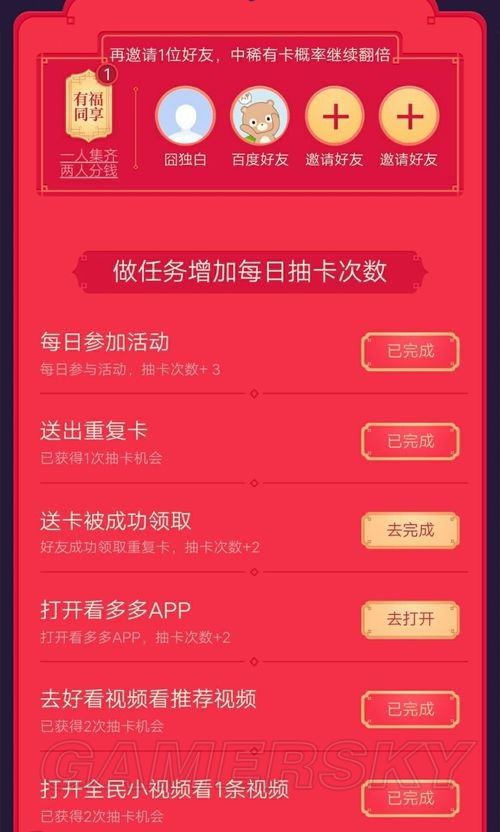 任务有很多,跟着去完成就好,比如”打开看多多APP“点去打开,跟着指示下载看多多,就会增加两次抽卡机会。