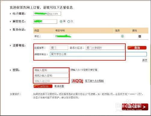 5、如果是*订餐,需要先填写送餐信息,依次填入邮箱号码,姓名,送餐地址和下次登录的密码,然后点击进入菜单。