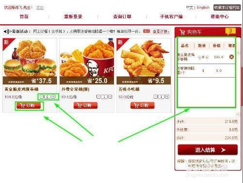 6、保存后,然后选择要使用送餐地址,确定后回到食品介绍界面,选择份数,点击订购。就可以将需要的食品加入右侧的购物车中。