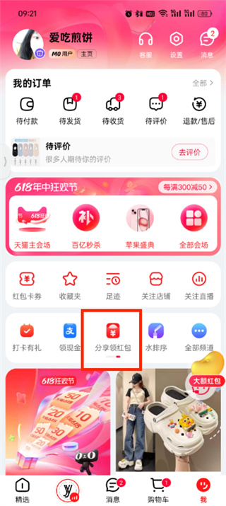 2、然后在我的页面中可以看到有打卡有礼、领现金、分享领红包、水排序等,我们点击【分享领红包】;