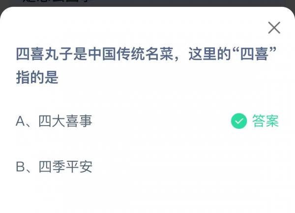 2022支付宝蚂蚁庄园4月18日的题目为:四喜丸子是中国传统名菜这里的四喜指的是?四大喜事还是四季平安呢?很多小伙伴可能还不太清楚。下面小编就为玩家们带来了正确答案分享,希望能帮助到你。