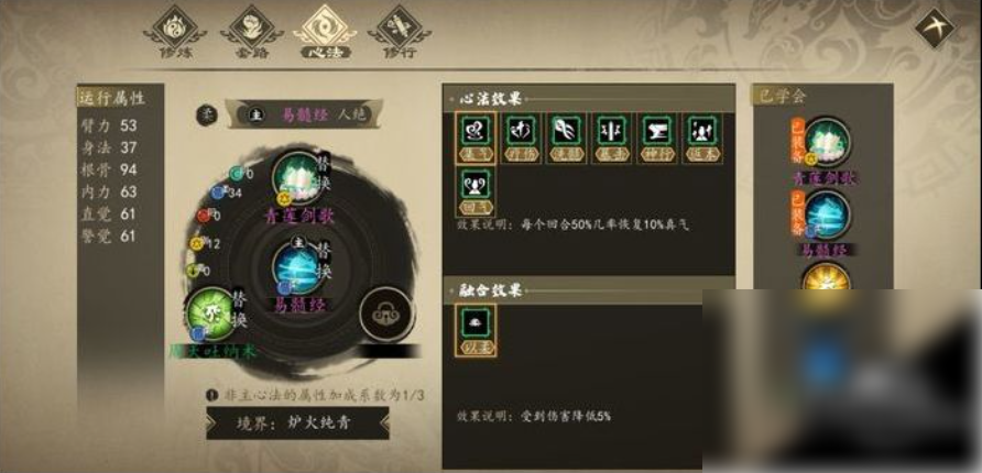 3、后面主角与杨隐雪集火boss。(战斗中主角消耗一颗金疮药,杨隐雪消耗2颗补气丹。心法如上图。