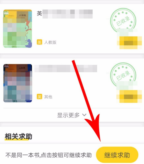 扫描之后,在“求助提示”界面,快对作业会给出可能想要找的教材答案,经过查看不是自己想要的时候,点击底部的“继续求助”