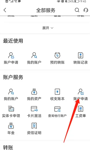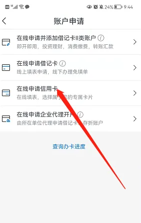 进入全部服务界面—选择账户服务—点击账户申请—点击在线申请信用卡