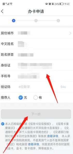 进入在线申请信用卡界面—输入身份证号码、姓名、电话号码等(如有推荐人点击推荐人)—点击下一步—完成单位名称和单位地址的填写——点击下一步即可完成在线申请信用卡