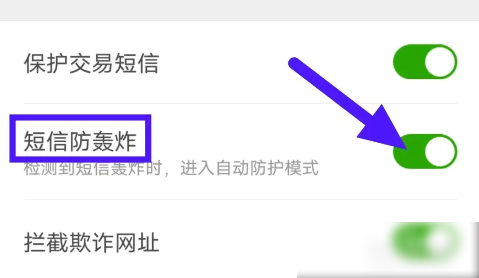 选择界面中的【短信防轰炸】开启,保存设置即可。
