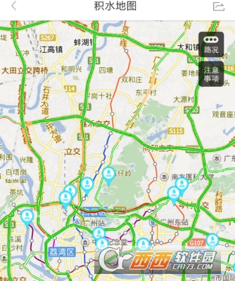城市积水发生时道路无法通行,可能会导致路况拥挤,因此还可以在积水地图界面的右上角点击“路况”按钮,查看对应的路况信息。其中绿色的道路表示畅通,红色道路表示拥挤,深红色道路表示严重拥挤,难以通行。