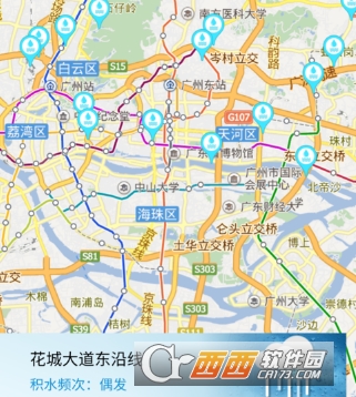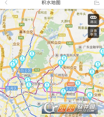 “积水地图”查询结果可以看到所在城市的积水分布情况。如图,每一个蓝色水滴标注表示一处积水。