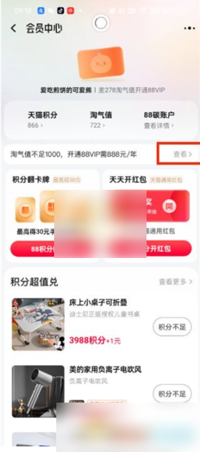 3、接着来到会员中心的页面中我们点击“淘气值不足1000,开通88VIP需888元/年”后面的【查看】或直接点击【淘气值】;