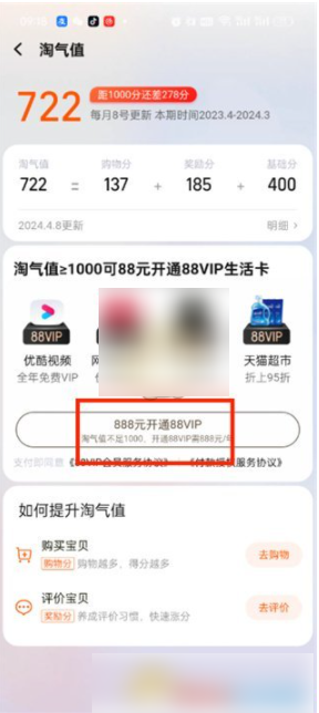 4、最后进入到淘气值的页面中我们只需要点击【888元开通88VIP】即可。