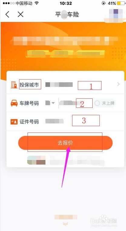 4.按要求填好“投保城市”“车牌号码”“证件号码”,然后点“去报价”