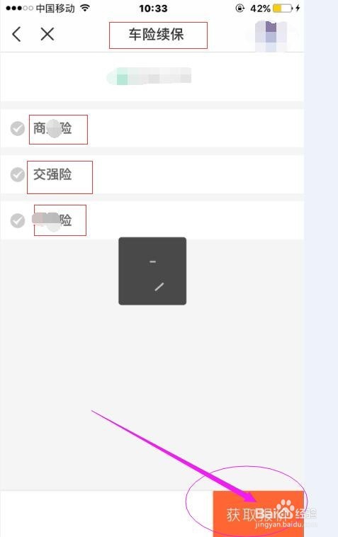 5.在“车险续保”页面,选好要交的险种,然后点右下角的“获取报价”