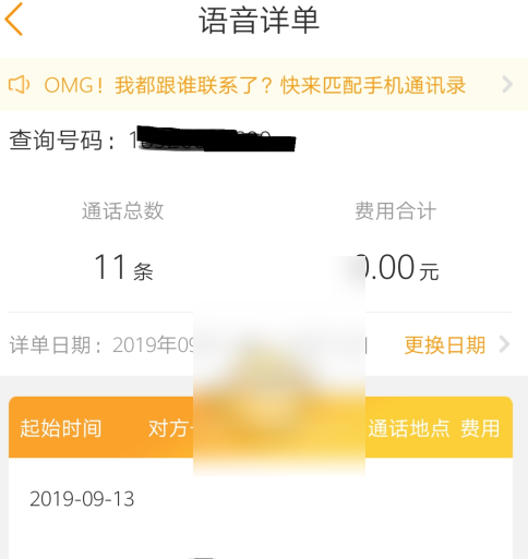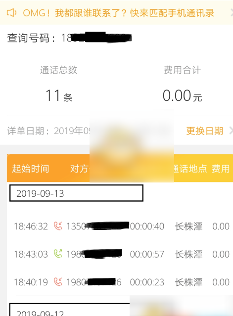 5、通话记录是按日来进行汇总显示,每日的通话记录汇总显示在一起。通讯记录显示信息包括日期和时间点,来电去电号码,通话时长,地址,费用信息。