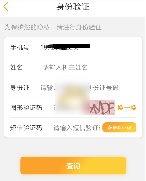 4、选择好日期后,点击”查询 “按钮进入身份验证,需要输入机主姓名、身份证及手机短信验证码后才可看到记录。