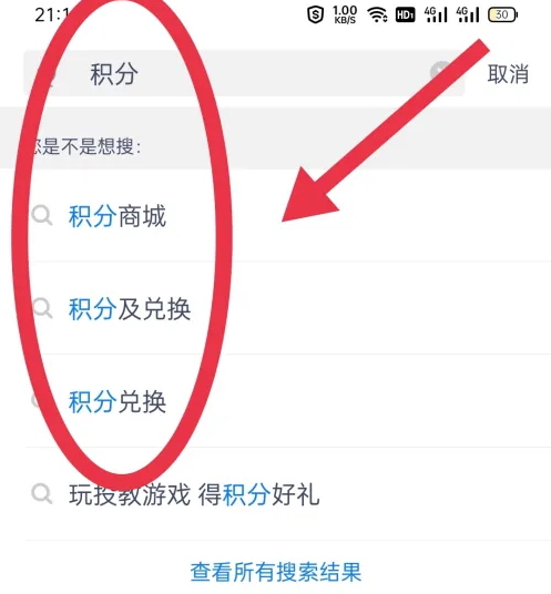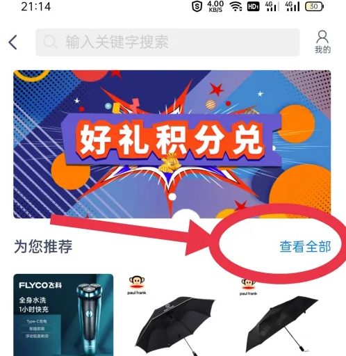 在首页上方中间搜索栏输入“积分”二字,便会出现“积分商城”,点击“积分商城”。如下图: