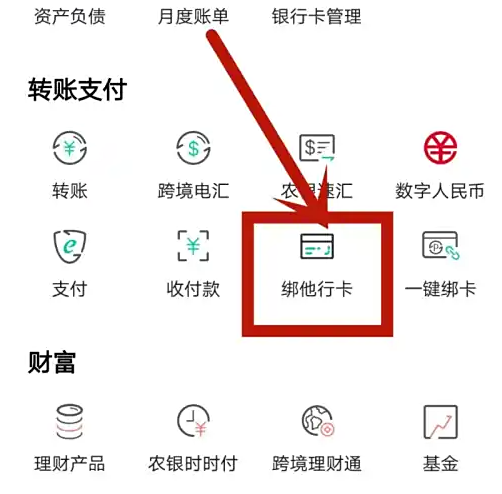 最后,点击转账支付中的【绑他行卡】选项,这样就可以绑定他行的卡了。