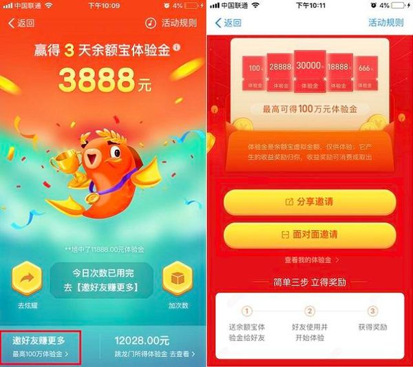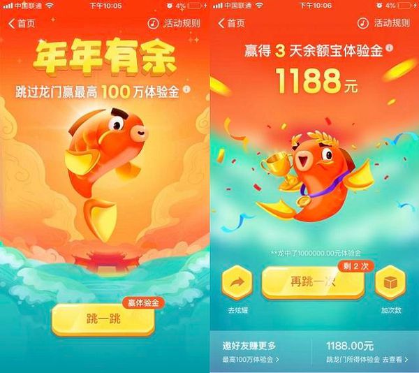 2019年1月15日,支付宝推出了开年红包,年年有余跳龙门活动,*高可得100万体验金活动。