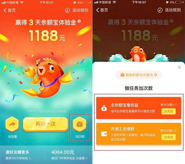 2、第一次玩,其实可以轻松获得6次游戏机会,当,当天默认的3次没有了之后,点击下方的“加次数”后,可以看到,去看一次余额宝收益可以再参加一次。此外,开通工资理财,也就是设置每月自动将银行卡的钱转入余额宝,还可以获得2次机会。