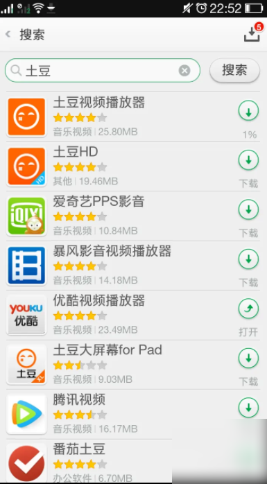 首先打开手机,打开软件商店软件,进入软件搜索界面,搜索土豆视频软件,点击土豆右边的下载按钮,进行下载操作。
