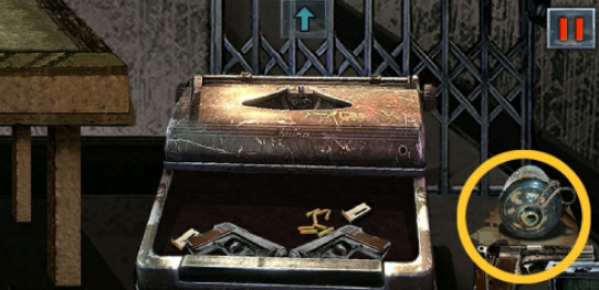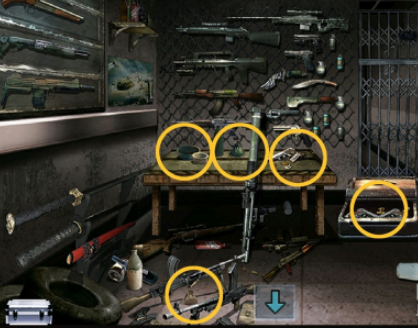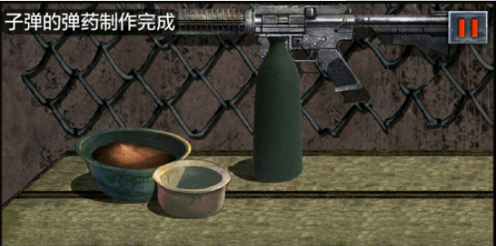 在武器库的桌子上有两个容器将[硫磺]、[木炭]和[硝酸钾]倒进其中一个容器里可以制造子弹的弹药,点击容器获得[弹药]。点击道具箱将[没有弹药的子弹]和[弹药]组合起来变成[子弹],再将[子弹]和[没有子弹的手枪]组合起来[手枪]就可以使用了。用[手枪]去攻击武器库左上角的瓶子可以得到一个刻着数字7的[黄球]。