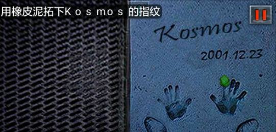 拿着橡皮泥回到进入末日公寓的走廊,在这里的地面上可以看到留作纪念的建造者的手印,其中就有Kosmos的,使用[橡皮泥]把Kosmos的指纹拓下,再取出[橡皮泥]。