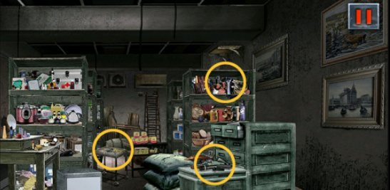 得到道具后首先将[电池]和[手电筒]组合起来,然后在左边架子的上方发现[红球],触碰[红球]会让它掉到地上,这时候去右边的柜子下面寻找,发现柜子下面一片漆黑,使用[手电筒]后就可以看到[红球]并拾取了。