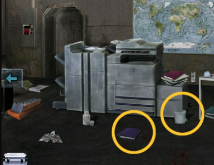 在打印机场景的地上有一个文件夹,拿开文件夹可以看到一个血手印,用[手机]把血手印照下来可以得到[地面血手印的照片]。打印机场景的垃圾桶旁边还有[橡皮泥],点击拾取即可得到。