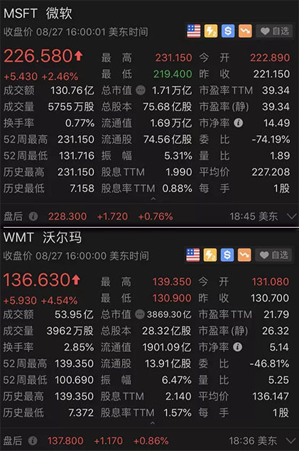 8月27日夜间,美股开盘后,微软股价直接拉升,一度冲高涨4.52%,截至收盘,微软股价涨逾2%。而沃尔玛股价也因此飙升,截至收盘,沃尔玛暴涨逾4%。不难看出,两家巨头股价暴涨的主要原因还是因为TikTok收购消息的发布。
