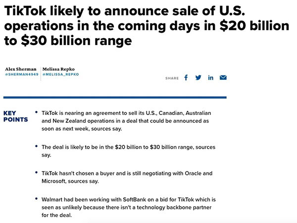8月27日晚间,据美国消费者新闻与商业频道(CNBC)报道,TikTok即将达成出售其美国业务的协议,并可能在未来几天内宣布交易。并且,多个消息源还告诉CNBC,梅耶尔的辞职表明,TikTok很可能会在未来48小时内与微软达成出售交易。