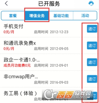 点击增值业务可以查询您当前开通的增值业务,如手机支付等一些附加的业务功能,每行业务最后面是退订按钮,不需要的可以选择点击退订